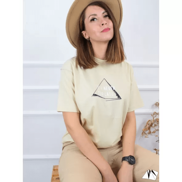A simple graphic T-shirt in beige with oversize cut. With black and white geometric drawing, our print is made by hand. With white text: it’s never too late, our black geometric drawing completes the composition in two colours.